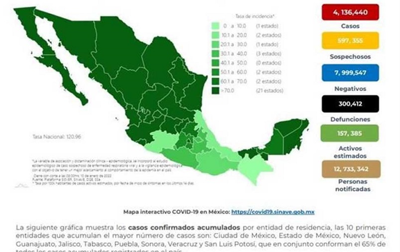 Ciudad de México – Agencia Reforma – La Secretaría de Salud (Ssa) registró otros 11 mil 52 casos confirmados de Covid-19 en México, para un total de 4 millones 136 mil 440.