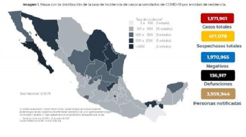 Ciudad de México – Agencia Reforma — La Secretaría de Salud reportó mil 235 muertes más por Covid-19 en México, con lo que suman 136 mil 917, y registró otros 15 mil 873 casos confirmados, para un total de un millón 571 mil 901.