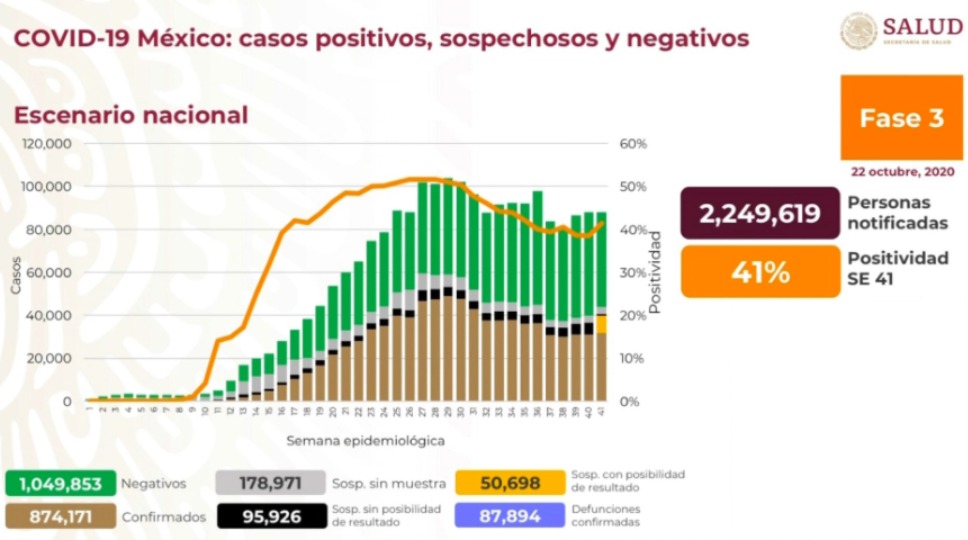 CDMX – Reforma — La Secretaría de Salud registró 479 muertes más por Covid-19 en México, con lo que suman 87 mil 894, y reportó 6 mil 612 casos confirmados, para un total de 874 mil 171.