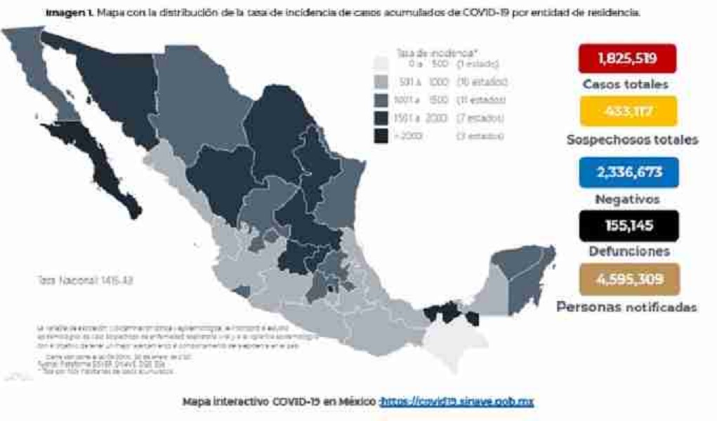 Ciudad de México – Agencia Reforma — La Secretaría de Salud reportó mil 506 muertes más por Covid-19 en México, con lo que suman 155 mil 145, y registró otros 18 mil 670 casos confirmados, para un total de un millón 825 mil 519.