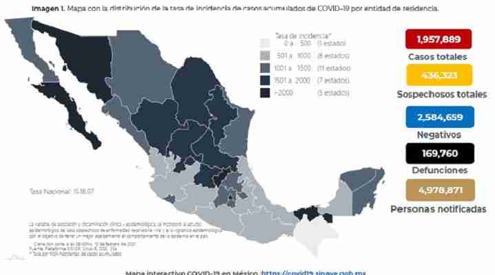 Ciudad de México – EFE – México acumula hasta este miércoles un millón 957 mil 889 casos positivos y 169 mil 760 muertes por Covid-19, de acuerdo con el Instituto Nacional de Salud Pública (INSP).