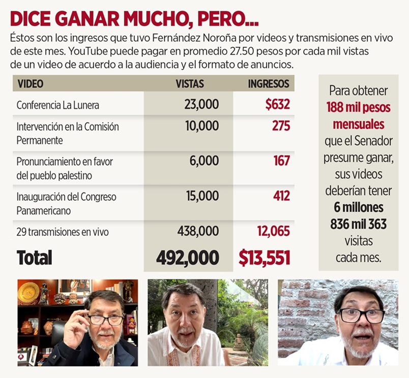 Para lograr los ingresos por 188 mil pesos mensuales que reportó Noroña en una de sus declaraciones patrimoniales, debía haber registrado 6 millones 836 mil 363 vistas cada mes, pues YouTube puede pagar en promedio 27.50 pesos por cada mil vistas de un video o transmisión, de acuerdo a la audiencia y formato de anuncios.
