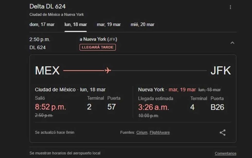 Se trata del vuelo DL624, cuya salida estaba prevista a las 14:50 horas pero que, según la aplicación de rastreo de vuelos en todo el mundo Flight Radar, despegó por fin a las 21:15.