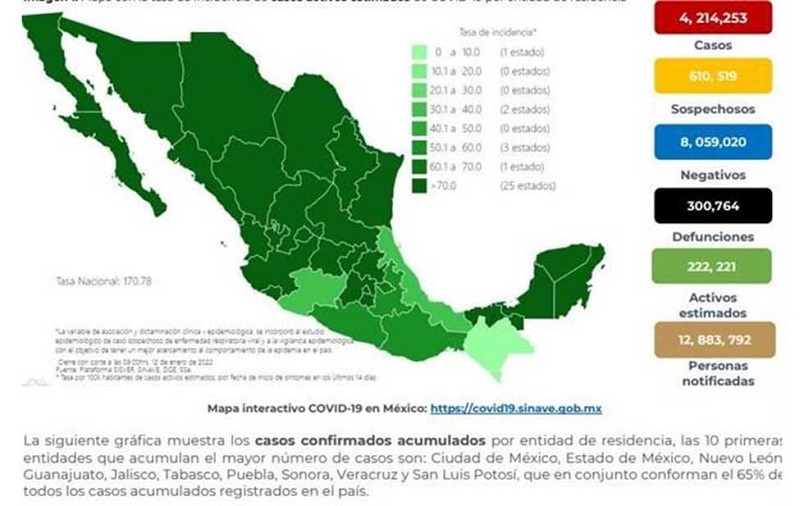 Ciudad de México. – Agencia Reforma – La Secretaría de Salud (Ssa) notificó otros 44 mil 187 casos confirmados de Covid-19 en México, la cifra más alta registrada en un día, para un total de 4 millones 214 mil 253.