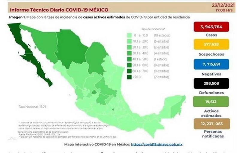 En su comunicado técnico la Ssa informó que se tienen registrados 18 mil 381 casos activos, con una tasa de incidencia de 14.2 por 100 mil habitantes.